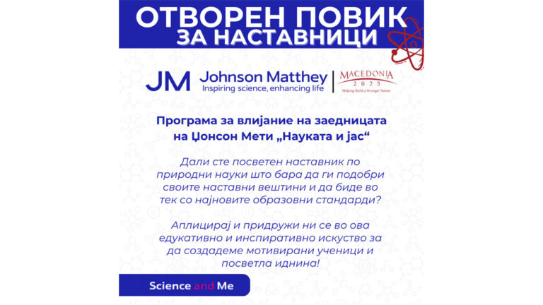 Македонија2025 објавува единствена можност за обука на 20-25 наставници по природни науки во основните училишта во Македонија. Обуката се реализира како дел од соработката на Македонија2025 со компанијата Џонсон Мети,