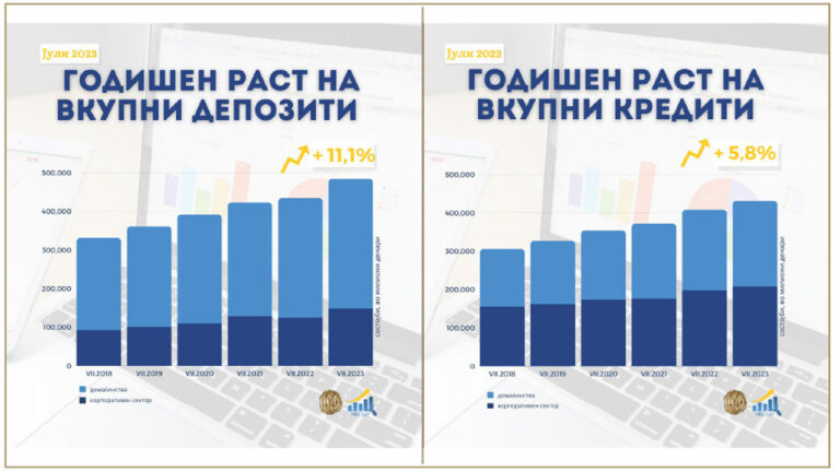 Анализирано на годишно ниво, вкупните депозити се зголемени за 11,1%, што произлегува од зголемувањето на депозитите на двата сектора, со малку поизразен придонес на секторот „домаќинства“. Годишниот пораст на кредитите