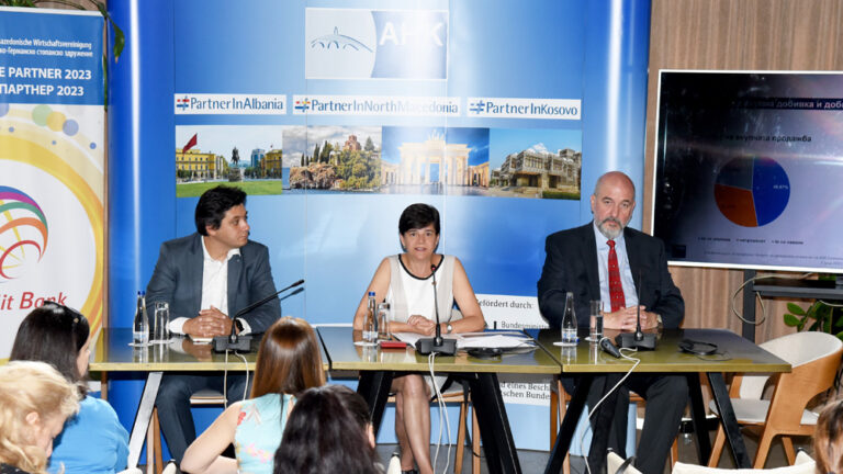 лево кон десно:Мартин Николовски, заменик претседател на Македонско-Германското стопанско здружениеАнтје Ванделт, директор на АХК Северна Македонија и раководен член на Управниот одбор на Македонско-Германското стопанско здружение.Ото Граф, заменик германски амбасадор