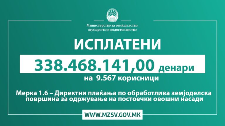 Извршена е исплата во износ од 338.468.141 денари кон 9.567 лица. Истата е реализирана согласно Мерка 1.6 – директни плаќања по обработлива површина за одржување на постоечки овошни насади, со