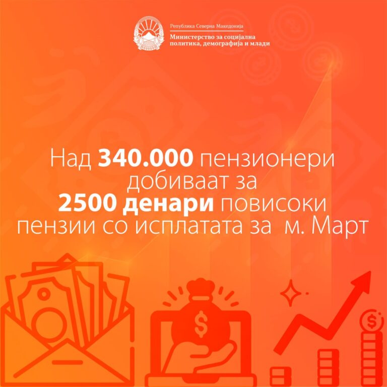 Над 340.000 пензионери во Република Северна Македонија од денес ќе добиваат за 2500 денари повисока пензија. Со линеарното покачување на пензиите во месец Септември и мартовската пензија во месец Април,