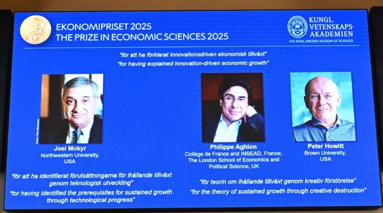 Кралската шведска академија ја додели Нобеловата награда за економија за 2025 година на Џоел Мокир, Филип Агион и Питер Хауит за нивниот придонес во објаснувањето на економскиот раст заснован на