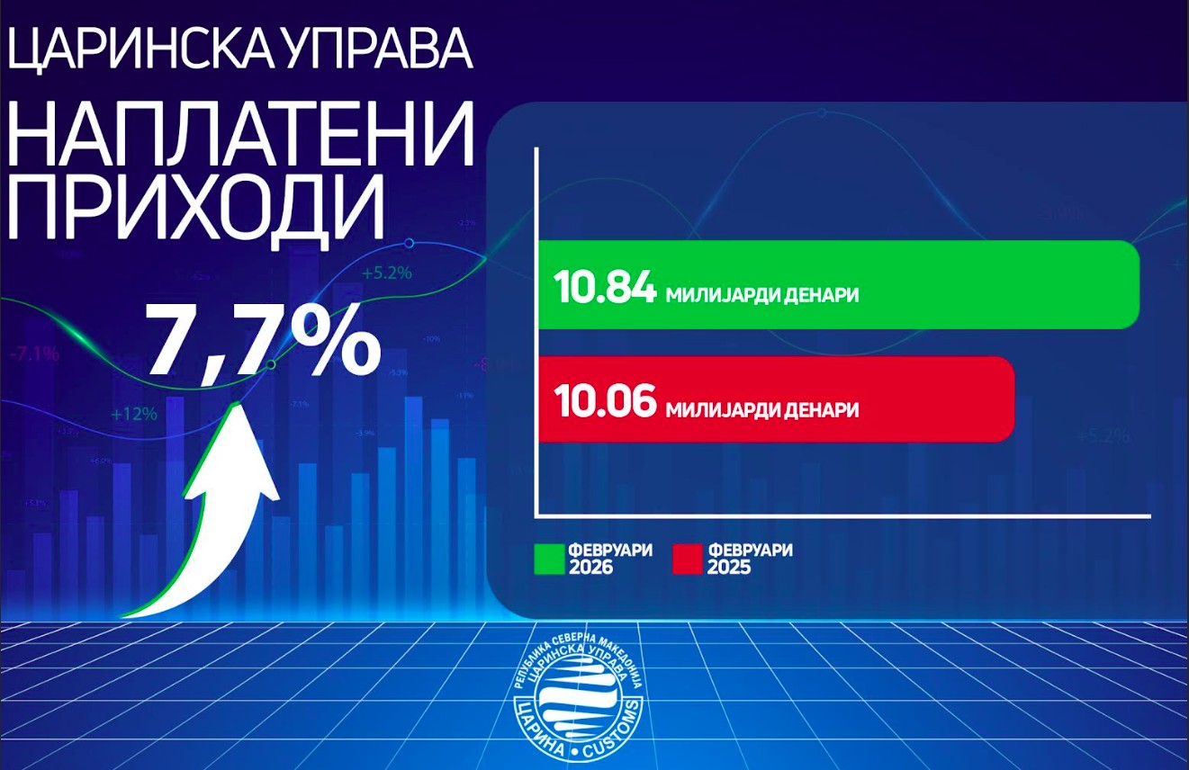 За 778,3 милиони денари или 7,7% е зголемена наплатата на приходи во февруари, период во кој Царинската управа наплати вкупно 10,8 милијарди денари. Притоа раст во наплатата е забележан по
