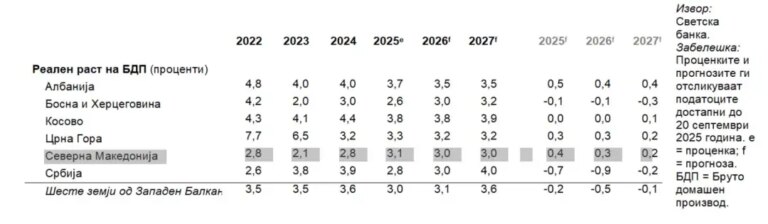 Реален раст на БДП од 3,1 отсто во 2025 година, од 3 проценти во 2026-та и од 3 отсто во 2027 година се проценките на Светска банка за земјава. Според