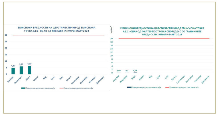 Во првиот квартал од 2024 година емисиите на цврсти честички од сите мерни точки во Макстил продолжуваат да бидат далеку пониски од дозволените европски гранични емисиони вредности и воедно пониски