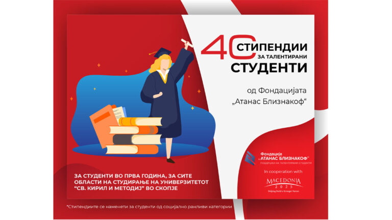 Македонија 2025 и Фондацијата „Атанас Близнакоф“ при Универзитетот „Св. Кирил и Методиј“ во Скопје распишаа КОНКУРС за доделување 40 (четириесет) “стипендии за талентирани студенти „Атанас Близнакоф„ за учебната 2021/2022. Стипендиите