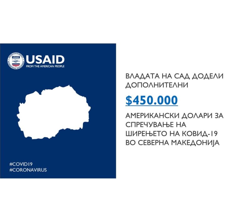 Соединетите Американски Држави преку Агенцијата на САД за меѓународен развој (УСАИД), доделија дополнителни 450.000 американски долари за поддршка на Северна Македонија во борба против пандемијата COVID-19, со тоа достигнувајќи го