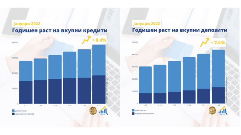 НБ: Во јануари: Годишен раст од 7,4% на вкупните депозити и од 8,4% на вкупната кредитна поддршка