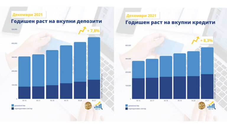 НБ: Во декември: Годишен раст од 7,8% на вкупните депозити и од 8,3% на вкупната кредитна поддршка во декември 2021