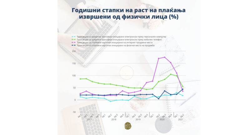Плаќањата од страна на граѓаните во трговијата во земјата со платежни картички издадени од издавачи во земјата, во вториот квартал од 2021 година, забележаа значителен годишен раст кај вредноста и