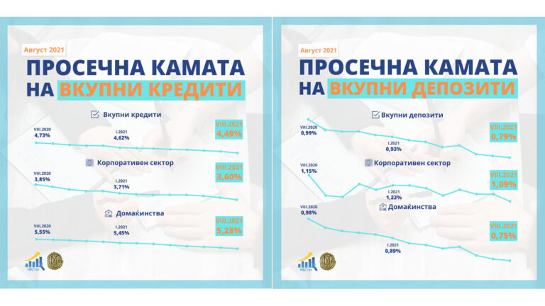 Во август продолжи трендот на намалување на просечната каматна стапка на вкупните кредити и таа се сведе на ниво од 4,49%. Просечната каматна стапка на вкупните депозити во август изнесува