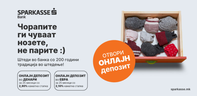 Во месецот на штедење, Шпаркасе Банка АД Скопје воведува нов дигитален производ наменет за штедење – Онлајн депозит со промотивни каматни стапки и целосна дигитална достапност. Депозитот претставува стратегиски чекор