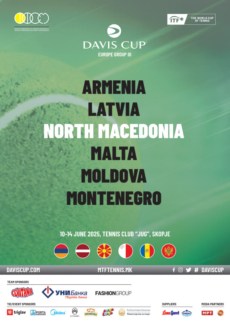 Тениската Федерација на Македонија е домаќин на Светското првенство во тенис за мажи DAVIS CUP Europe Group III. Овој значаен турнир со репрезентативен карактер ќе се одржи во Тенискиот клуб