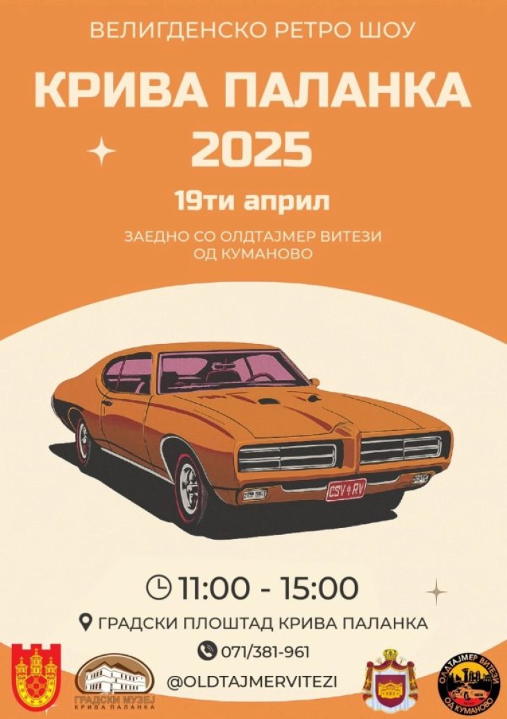 По повод на велигденските празници Општина Крива Паланка во соработка со клубот „Олдтајмер Витези“ од Куманово организира „Ретро шоу на олдтајмери“ на централниот градски плоштад, во сабота,19 април, со почеток