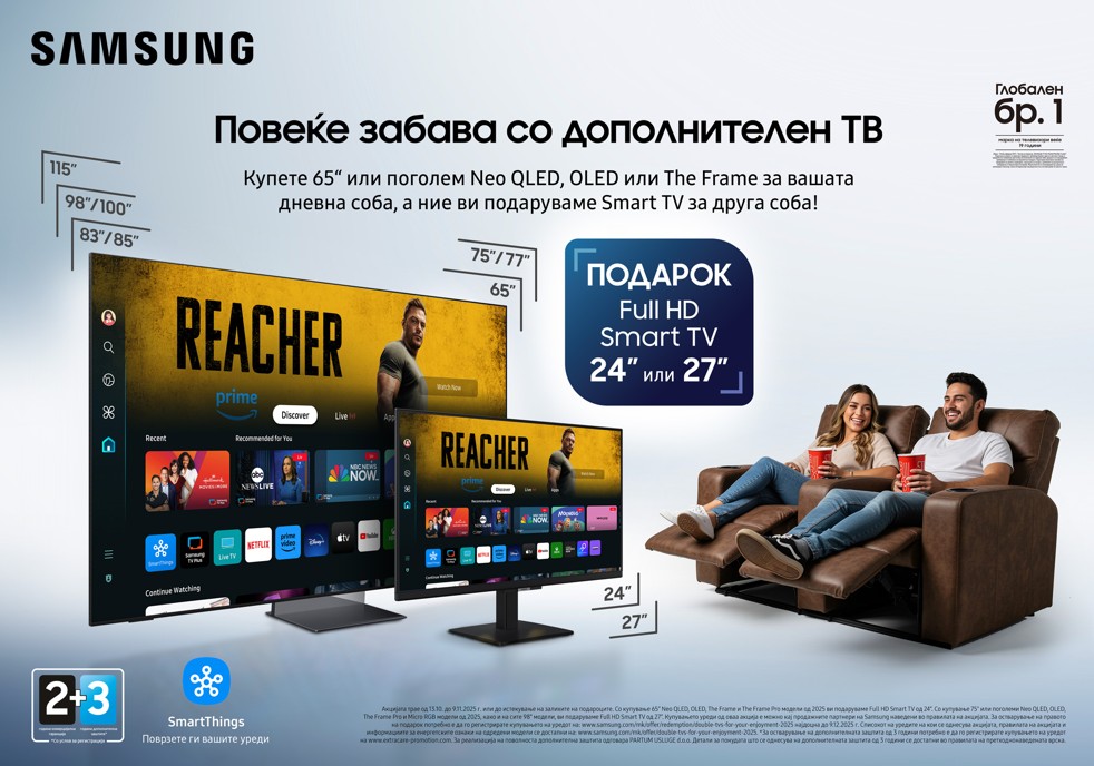 Samsung Electronics со големо задоволство ја најавува својата најнова Dual Screen промоција, која трае од 13 октомври до 9 ноември 2025 година. Оваа возбудлива кампања им овозможува на купувачите да го удвојат своето искуство при гледање, така што со купување на одбрани Samsung телевизори добиваат помал телевизор (24-инчен или 27-инчен Full HD Smart TV) како подарок. Без разлика дали сте љубител на спорт, семејство што сака да ја унапреди домашната забава или студент кој бара повеќе флексибилност, оваа промоција носи практичност и уживање во секој агол од домот.